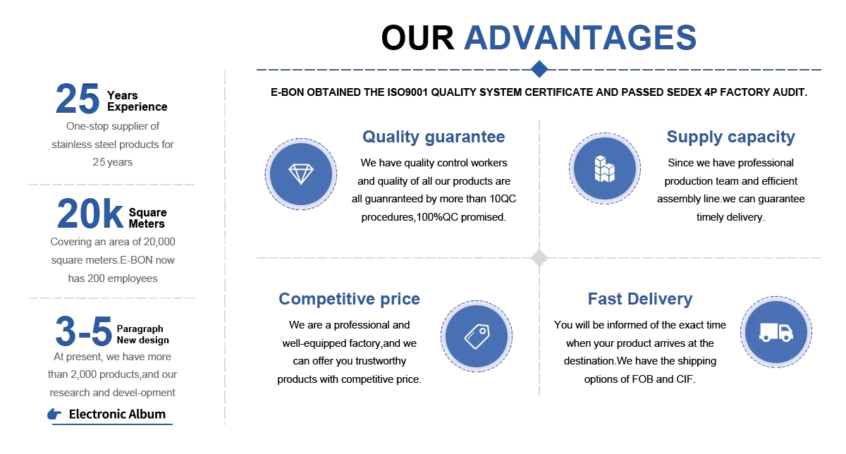 Established in 2000, Shenzhen E-BON Industrial Co., Ltd. is a professional supplier and exporter that is specialized in designing and manufacturing stainless steel kitchenware and barware for 25 years.