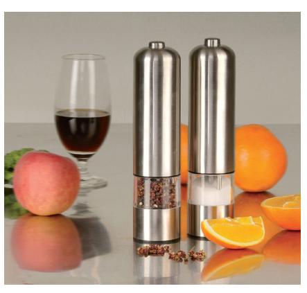| Features | Set of 2 (1 salt and 1 pepper) battery-powered grinders Easy and convenient way to enjoy foods with better taste Ceramic grinding mechanism can be adjusted from fine to coarse Brushed finish stainless steel construction |